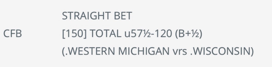 W 8/30: *late add under 57.5 (-120) Wisconsin vs. Western Michigan 1 unit +0.8 units